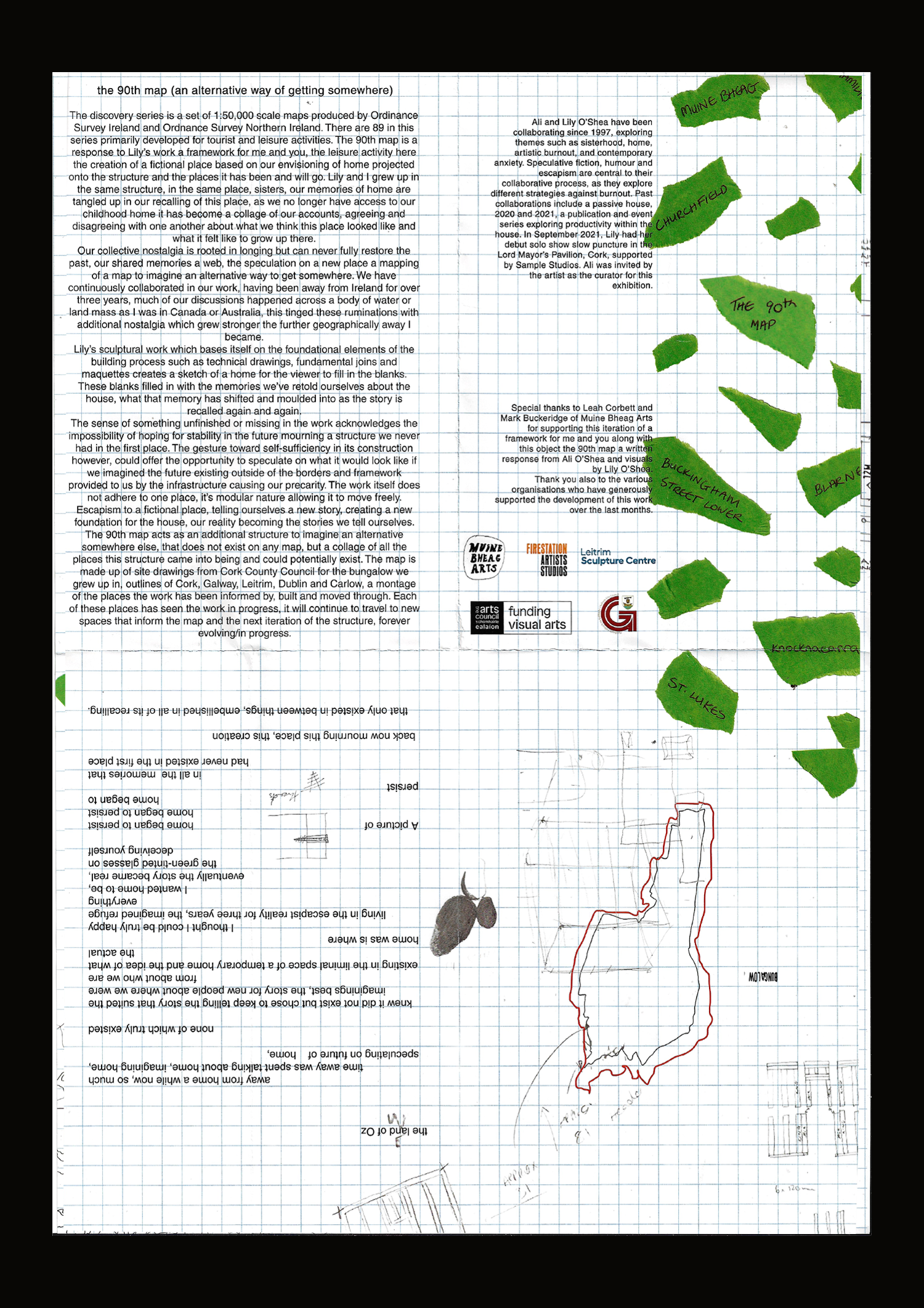 Informed by the eighty - nine Discovery Series maps of Ireland, it imagines a fictional 90th map composed of site drawings from Cork County Council for the bungalow they grew up in, outlines of Cork, Galway, Leitrim, Dublin, and Carlow, a montage of places the work has moved through.