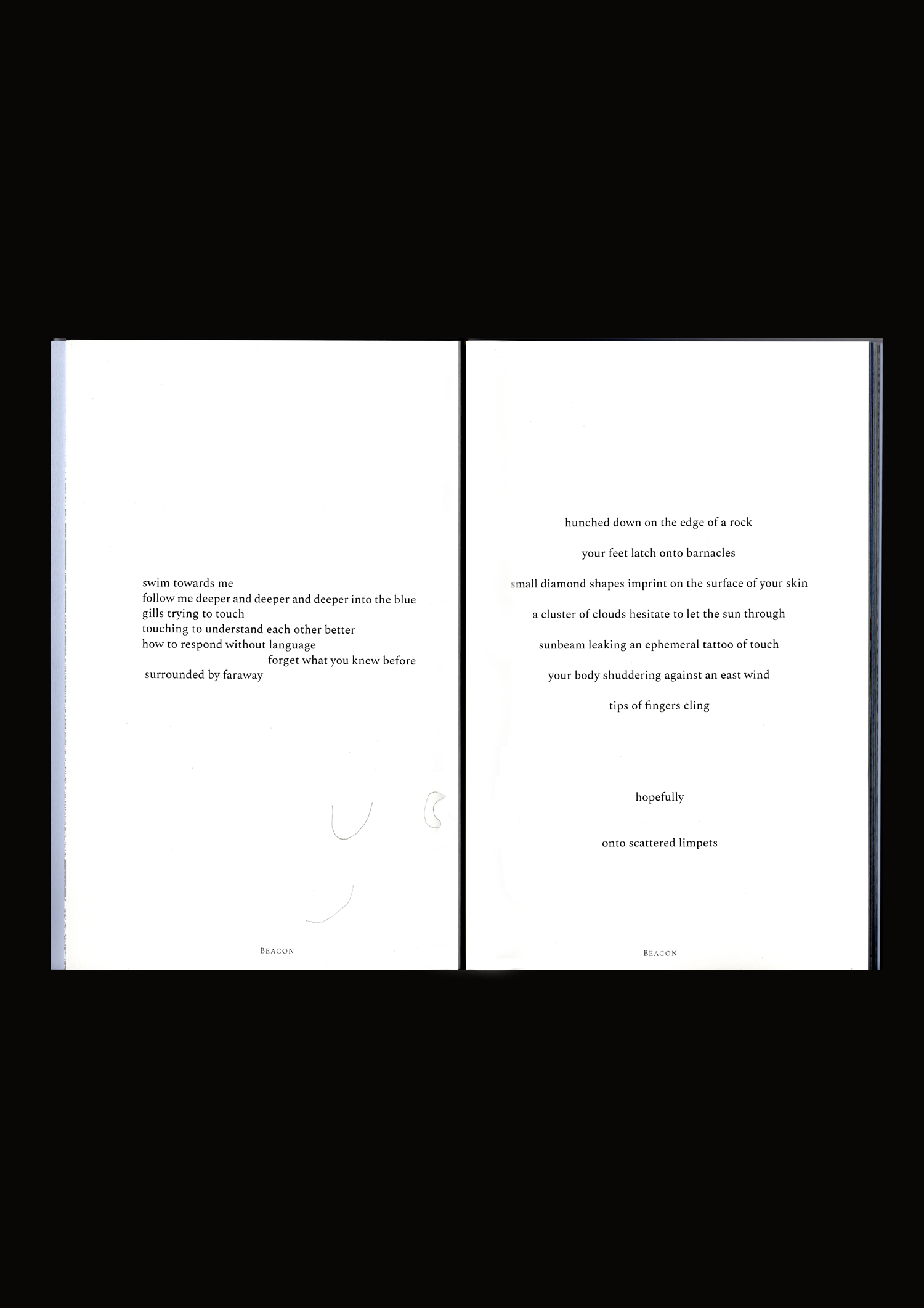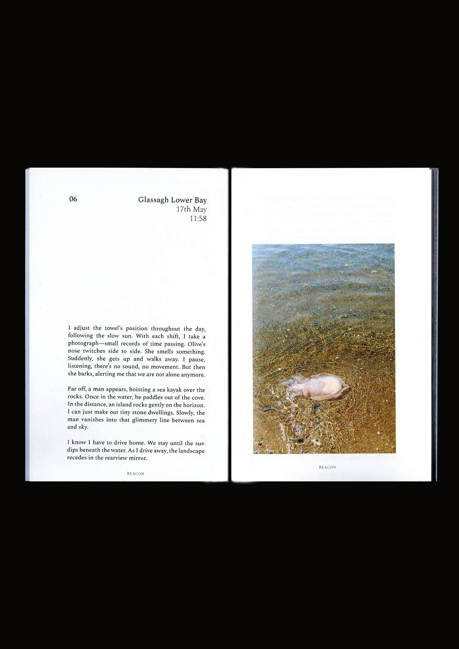 Beacon is a travelogue which traces Niamh Seana Meehan’s explorations around the coast of Ireland with her dog, Olive. A collection of meditations, sketches, and photographs offer Meehan’s reflections on being in transit and record intimate conversations with the landscape. Rituals of gathering, floating, and touching invite deep listening and an embodied connection with each place she encounters.